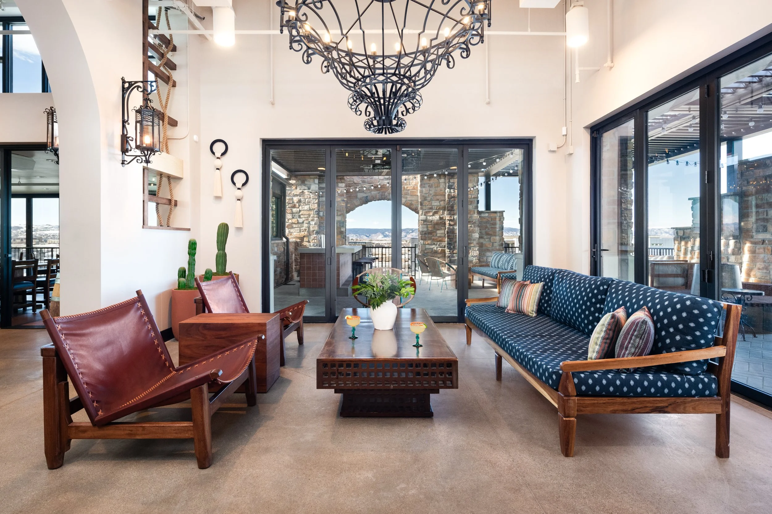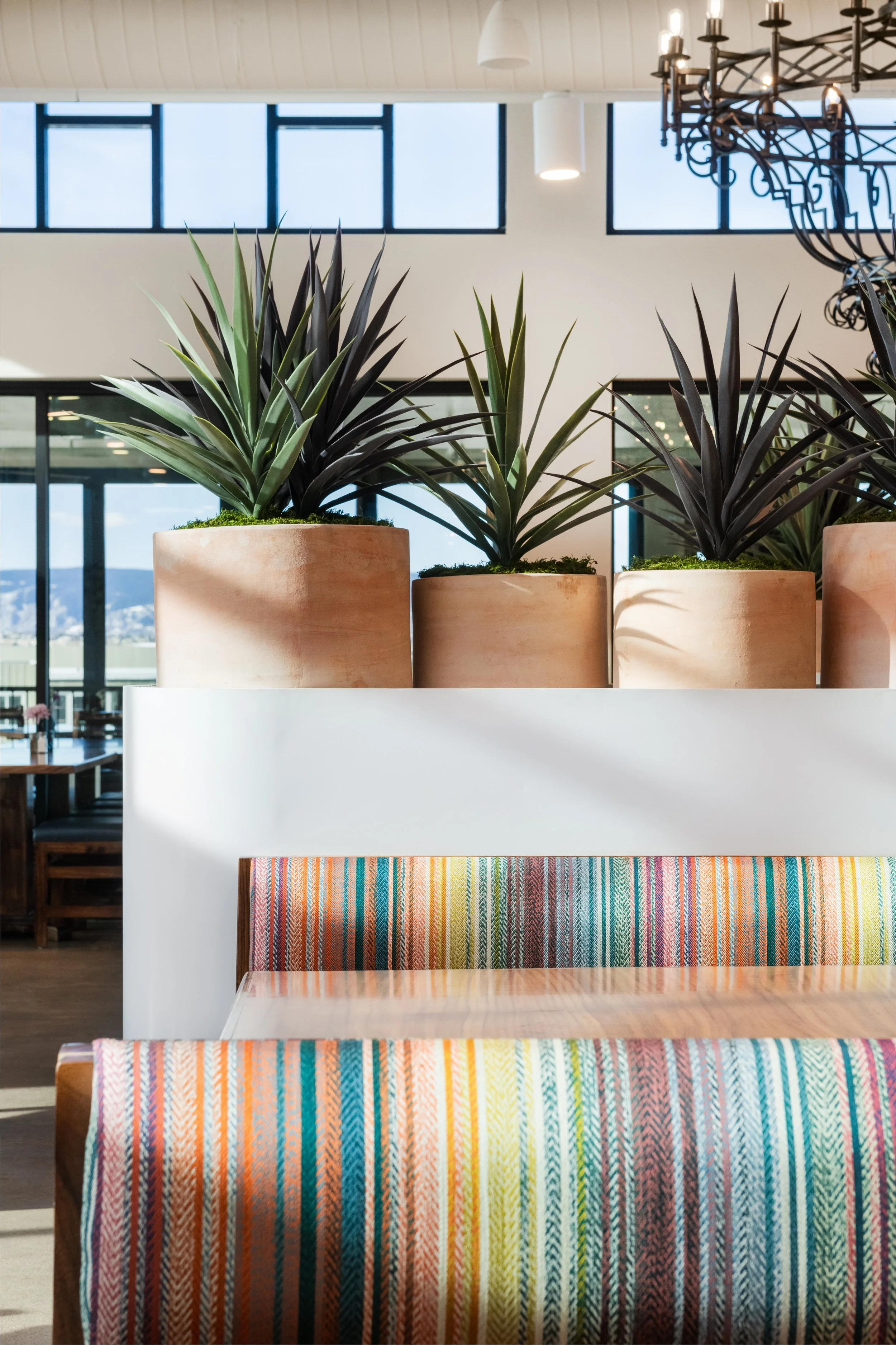 A longtime Colorado favorite, Los Dos Potrillos entrusted our Swan Dive team with its very first ground-up location in Castle Rock. The design itself blends the luxury of a Mexican resort, drawing inspiration from Cabo San Lucas, with the charm of a traditional ranch nestled amidst agave fields. The culinary journey begins at the entrance to the massive 9,000 square-foot space where vibrant Mexican textiles that offer a glimpse into the art of handmade tortilla-making. Sweeping views of Castle Rock are celebrated throughout the space, making it bright and airy for customers to enjoy the views. Vibrant textiles and expansive leather seating create a sophisticated atmosphere, while large planters with agave plants separate booth seating, evoking a sense of dining within an agave field.