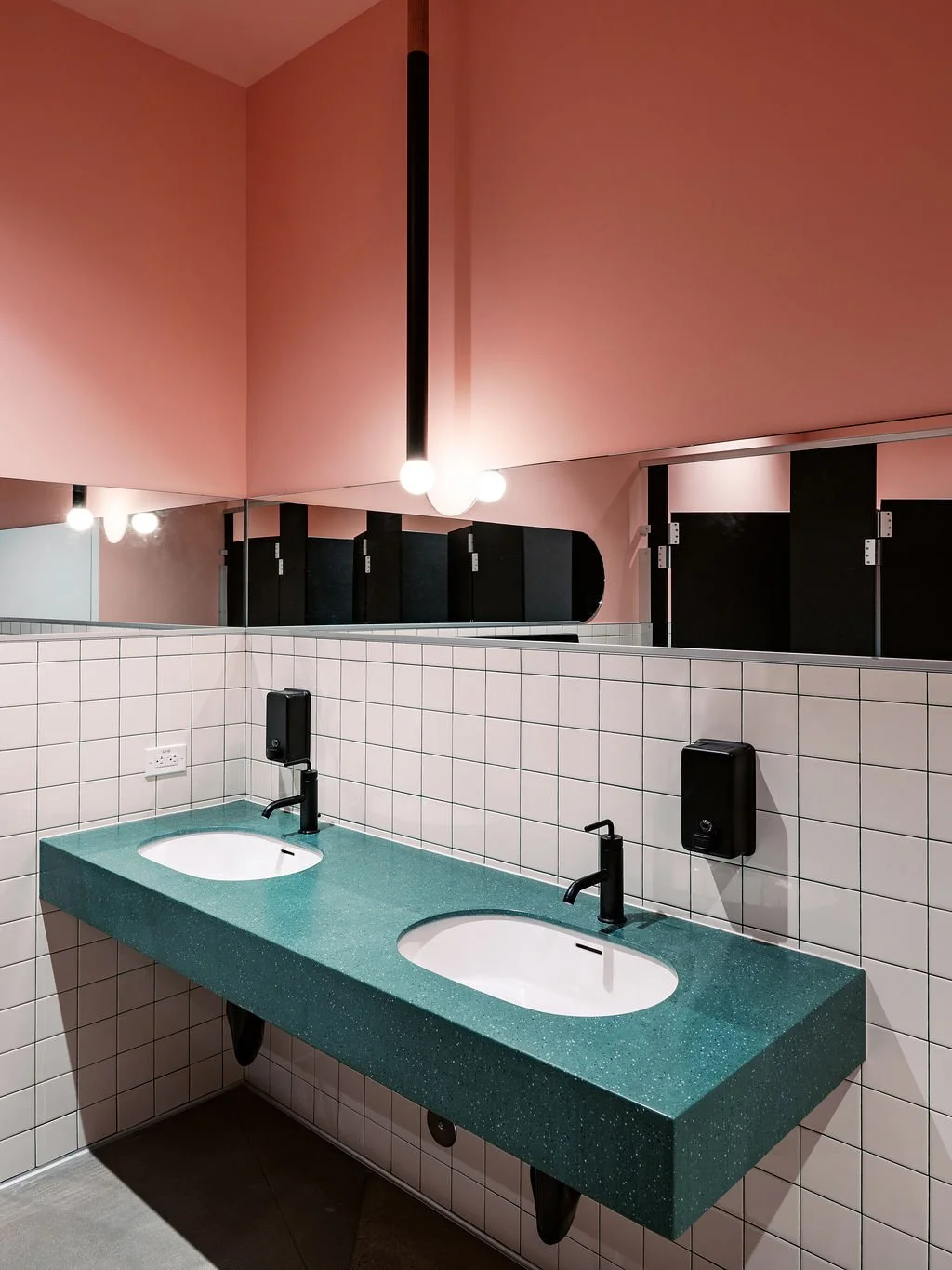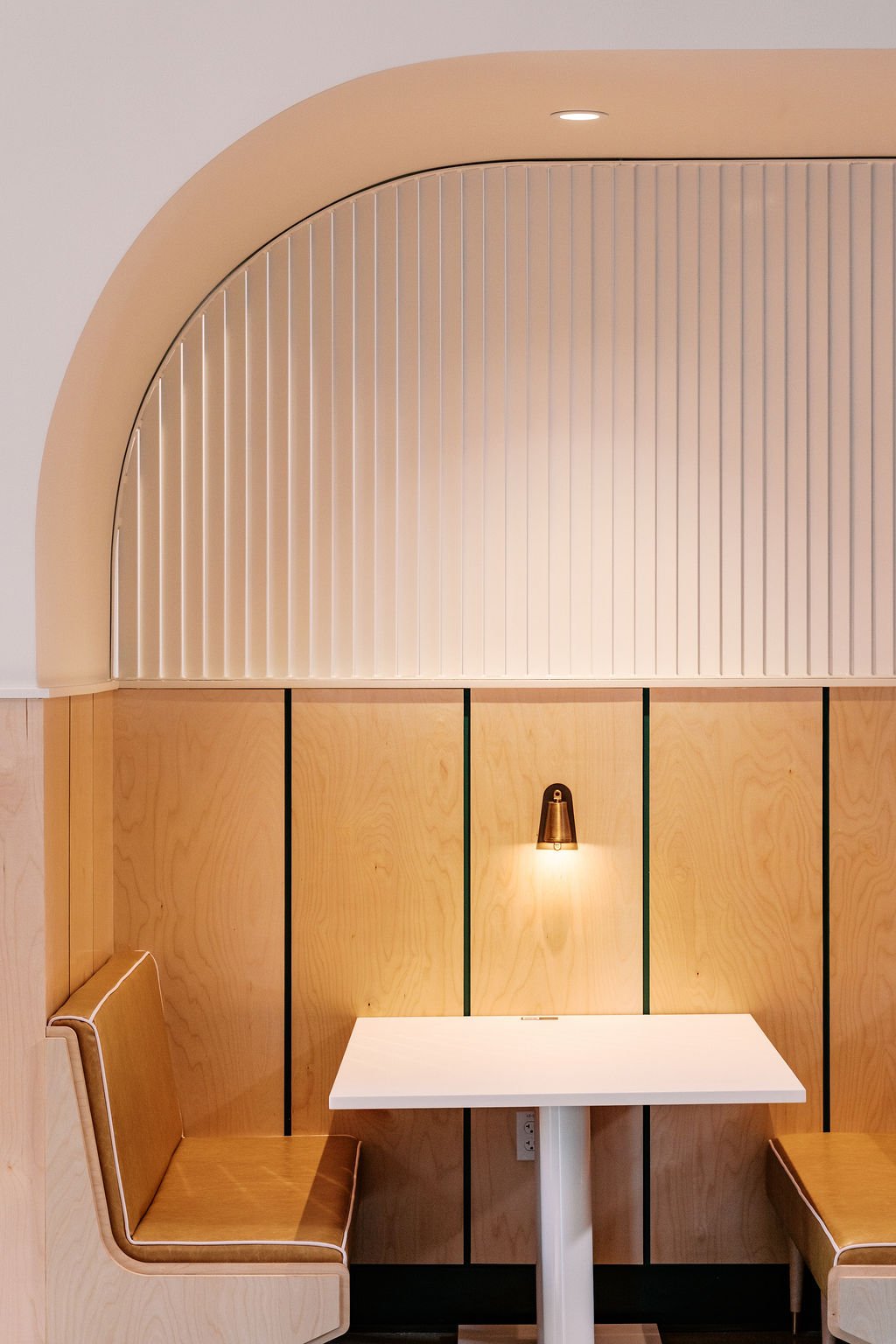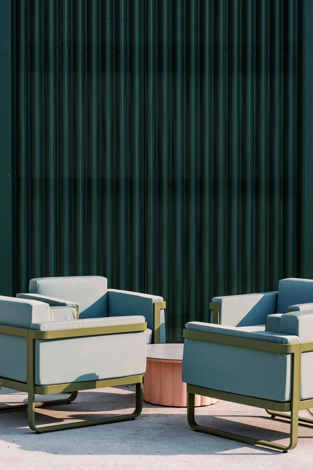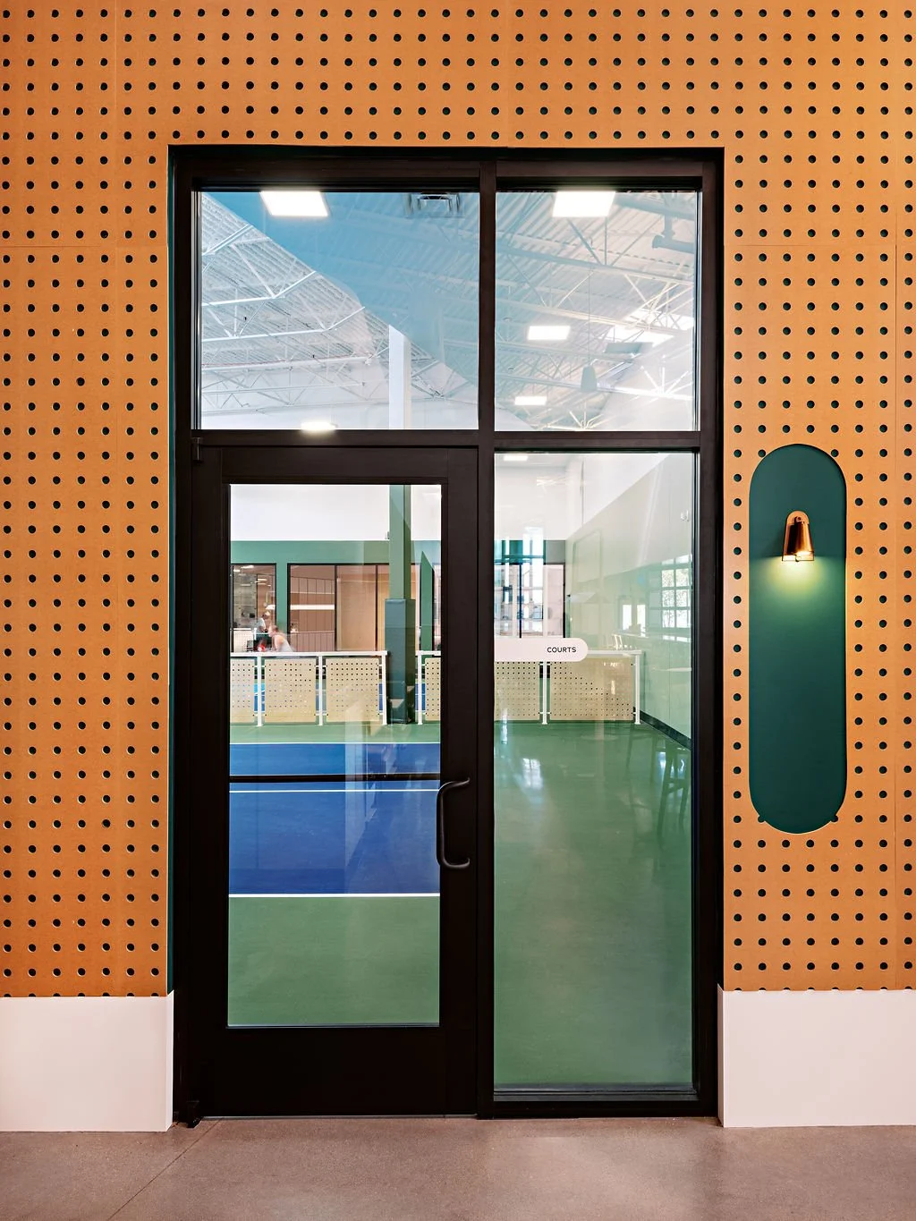 Throughout the space, we wove a visual and tactile language inspired by the sport itself. Pegboard millwork nods to the perforated pickleball, curved forms echo paddle silhouettes while tiled and upholstered grid patterns subtly reference the net. Playful yet refined, these tactile moments create a cohesive visual identity that ties together the building’s multiple uses.