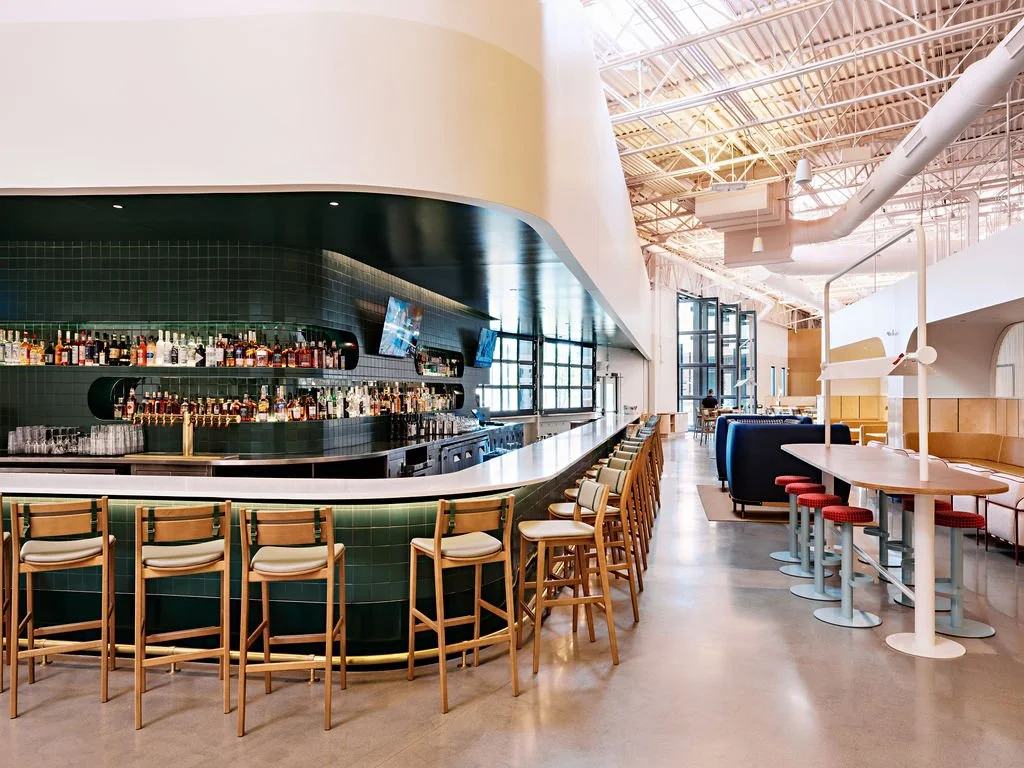 Meandering paths, layered ceiling heights, and textural variation invite people to linger and explore. One of the most rewarding design challenges was collaborating closely with the individual owners of all eight food concepts (many of them newer ventures) to craft custom kitchen spaces that captured their unique identity and helped express their brand voice for the first time. Each stall received its own distinct design language and color story, creating visual diversity within a cohesive whole. Giant pivot doors and garage-style openings dissolve the boundary between inside and out, leading to an expansive patio and game lawn where bocce, beer, and conversation flow freely.