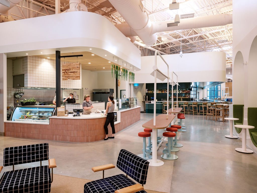 Salt & Vinegar is the second concept at Relish by owners Graham and Emily Smith. Built for grazing, Salt & Vinegar extends the couple’s culinary story into the art of gathering. For this design, the team at Swan Dive Design Studio channeled the palette of a charcuterie board with bread-white accents, honeyed woods, and soft, brick-tinted tiles along the counter.
